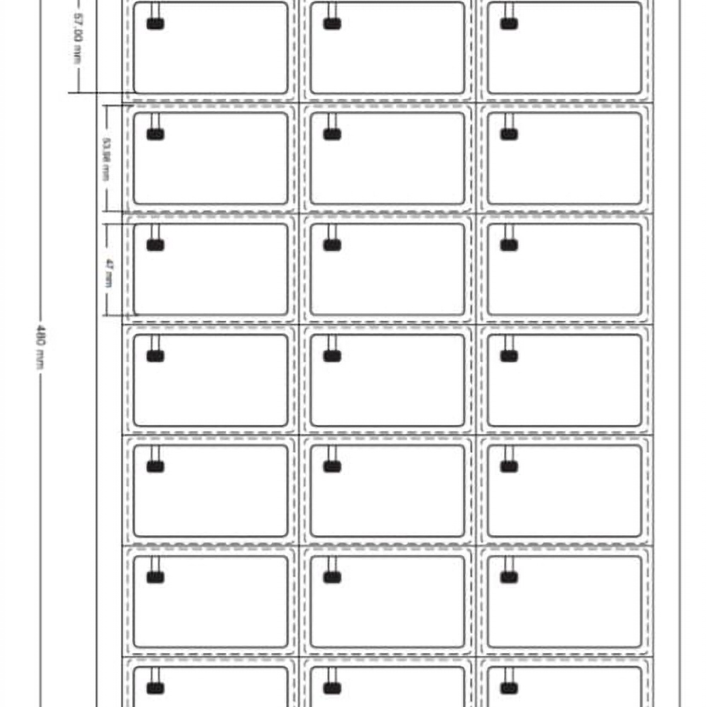 Wymiary arkusza wynoszą 300mm x 480mm x 0.5mm.Na każdym z arkuszy PVC znajduje się 3 x 8 = 24 układy elektroniczne RFID UNIQUE.
