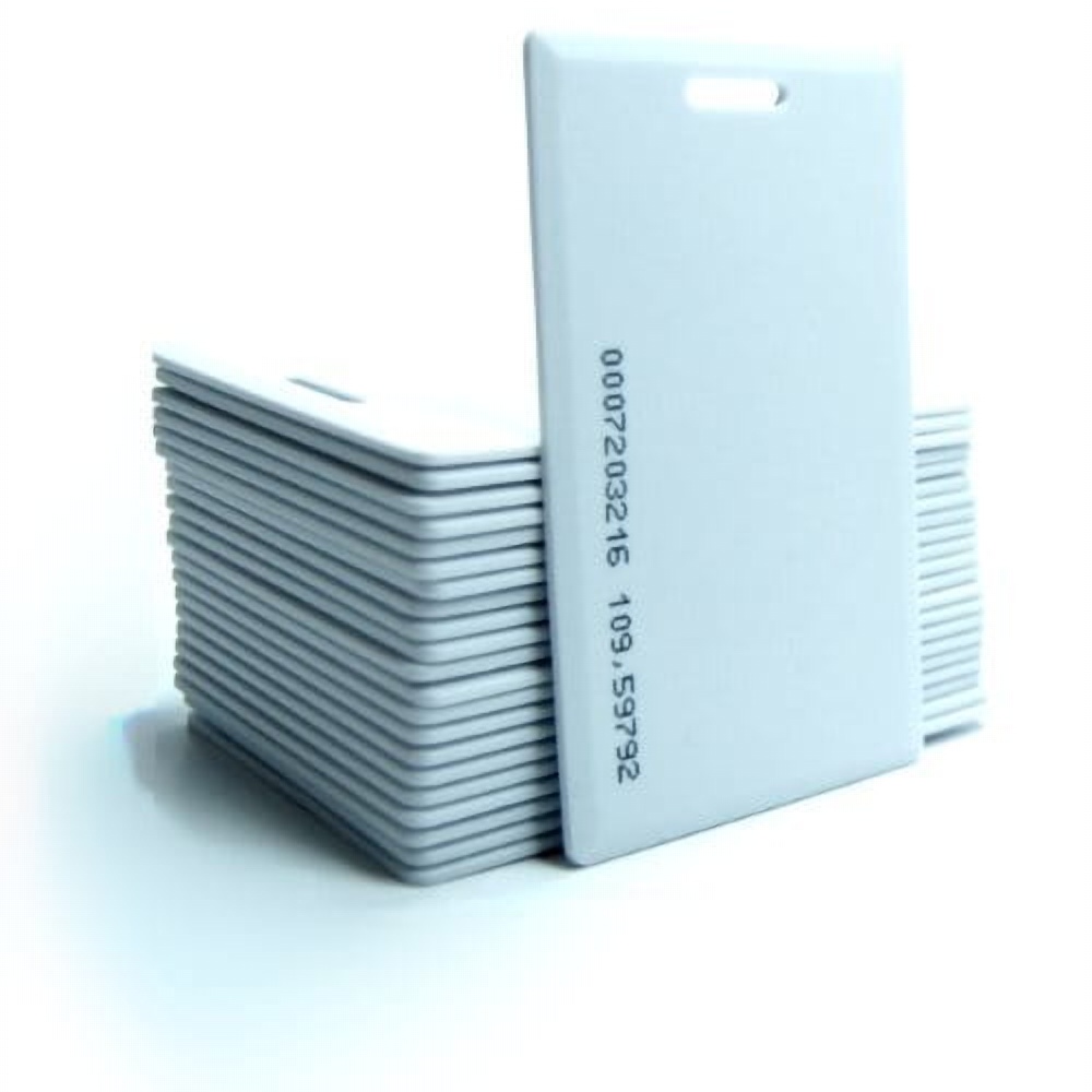 Karty zbliżeniowe 125 kHz z układem TK4100, kompatybilne z układami EM4100 oraz EM4102. Karty zbliżeniowe CLAMSHELL wykonane są z twardego tworzywa odpornego na uszkodzenia mechaniczne, w tym wygięcia i złamania. Karty RFID wyposażone są w otwór umożliwiający montaż zaczepu. Na powierzchni kart został nadrukowany ich unikalny numer seryjny.