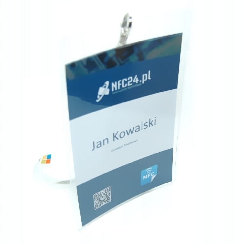 Identyfikatory produkowane na podstawie projektu klienta, wyposażone w układ NFC oraz kod QR. Na zakupiony produkt składa się: