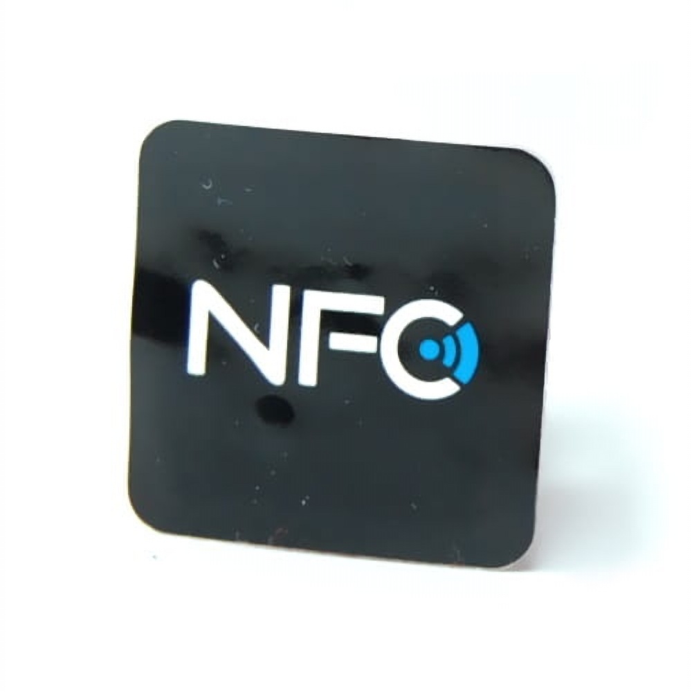 Czarne naklejki NFC z nadrukiem w bardzo małym rozmiarze 18mm x 18mm pokryte wodoodporną warstwą z polimeru.