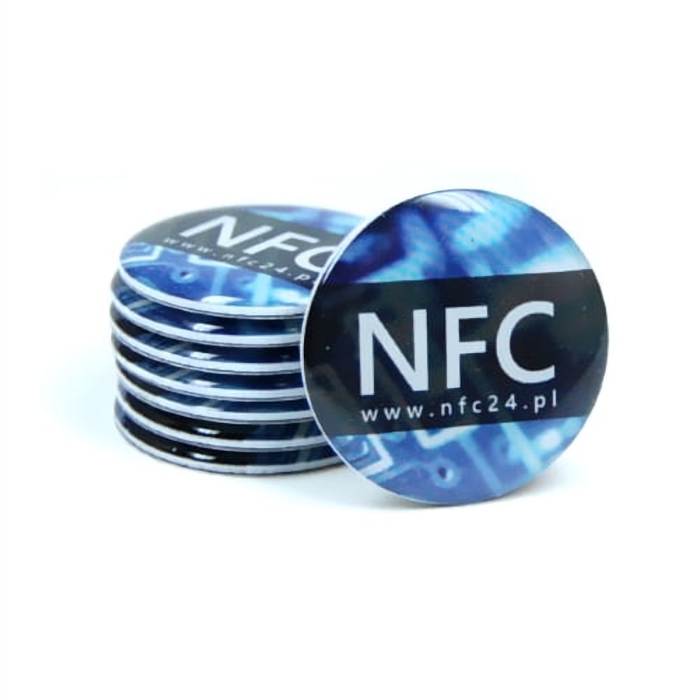 Naklejki NFC wykonane z miękkiego tworzywa, posiadające warstwę anti-metal, dzięki czemu mogą pracować po umieszczeniu na powierzchniach metalowych. Oferowane tagi NFC są wodoodporne, a wykonany nadruk jest wyjątkowo trwały dzięki zastosowaniu miękkiej, epoksydowej warstwy ochronnej. Żelowe naklejki posiadają wbudowany chip NFC NTAG213. Średnica znaczników NFC wynosi 35mm.